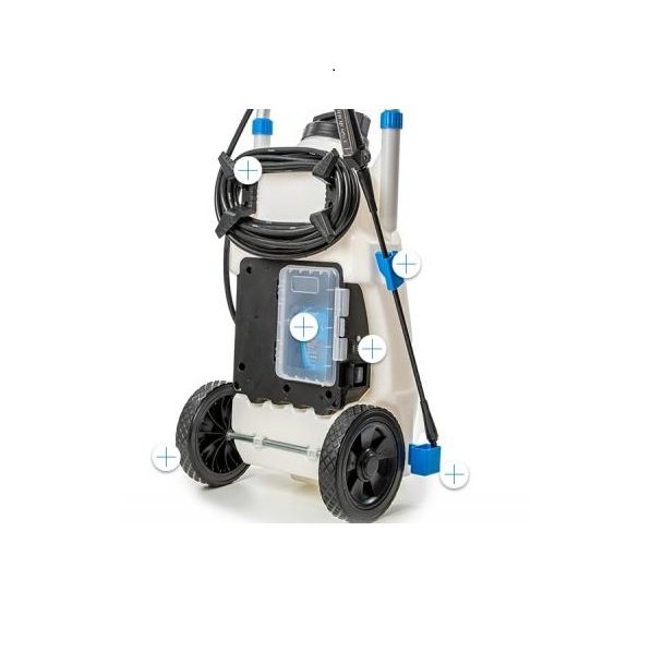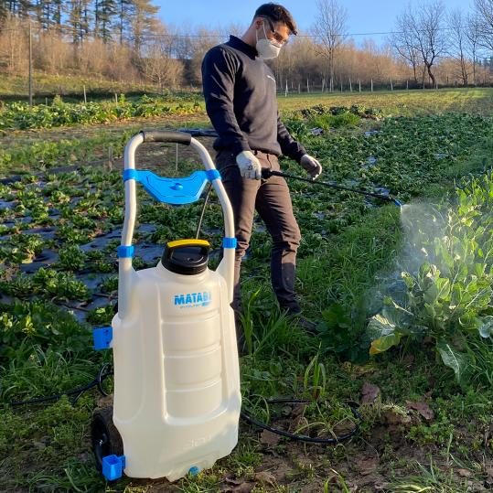 С капацитет от 30 литра, тази мобилна количка се справя безпроблемно с различни фитосанитарни приложения – унищожаване на плевели, третиране с инсектициди и фунгициди, пръскане с течни торове и други продукти от естествен произход.