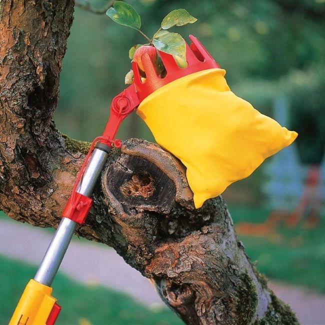 Подходящ за бране на плодове: Плодоберачът е предназначен за внимателно събиране на плодове от дървета и храсти, като чрез остър нож позволява лесно отделяне на плодовете, а меката, кръгла торба осигурява тяхното безопасно събиране без да се разтърсват.
